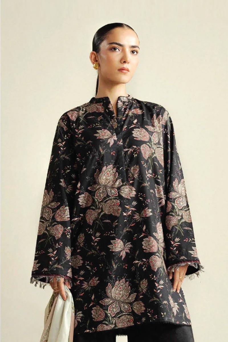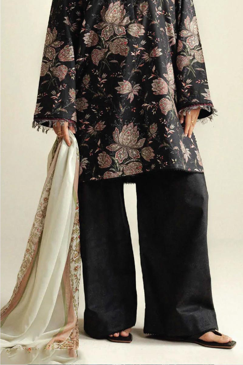 A bold black shirt paired with a printed trouser and a soft coffee beige dupatta, balancing depth with warmth.