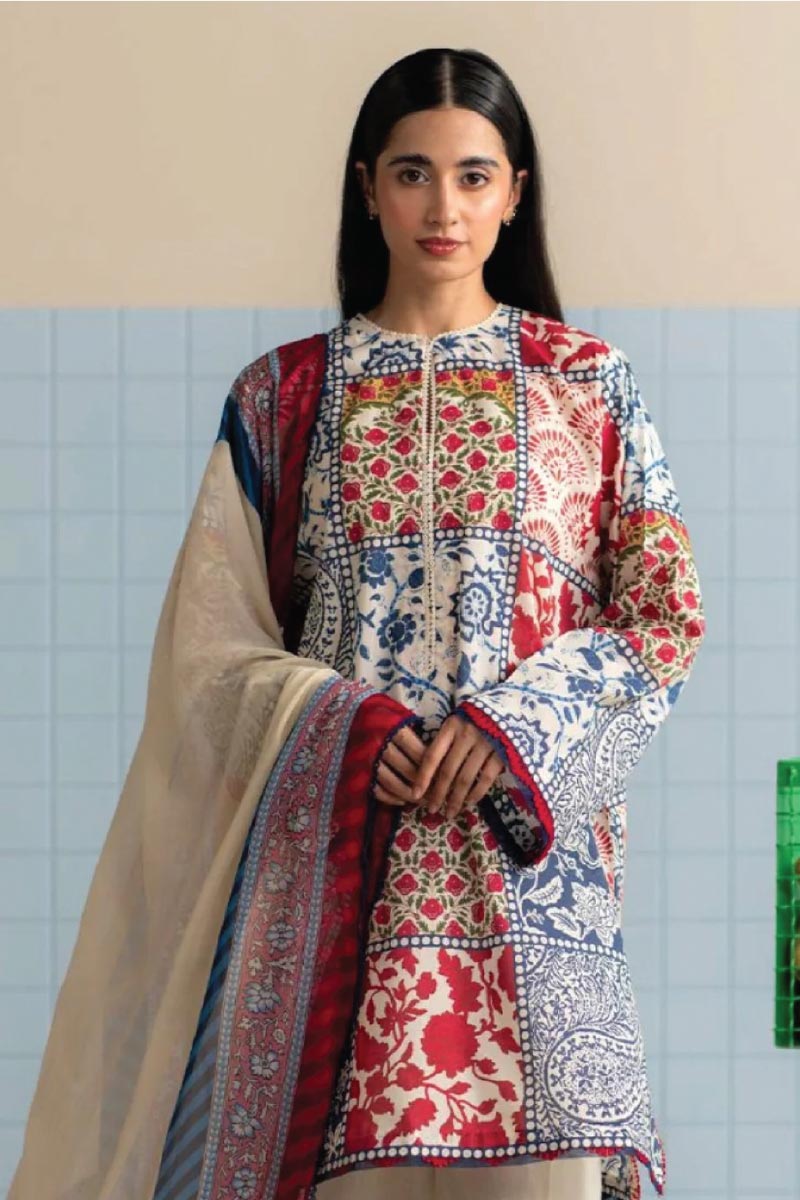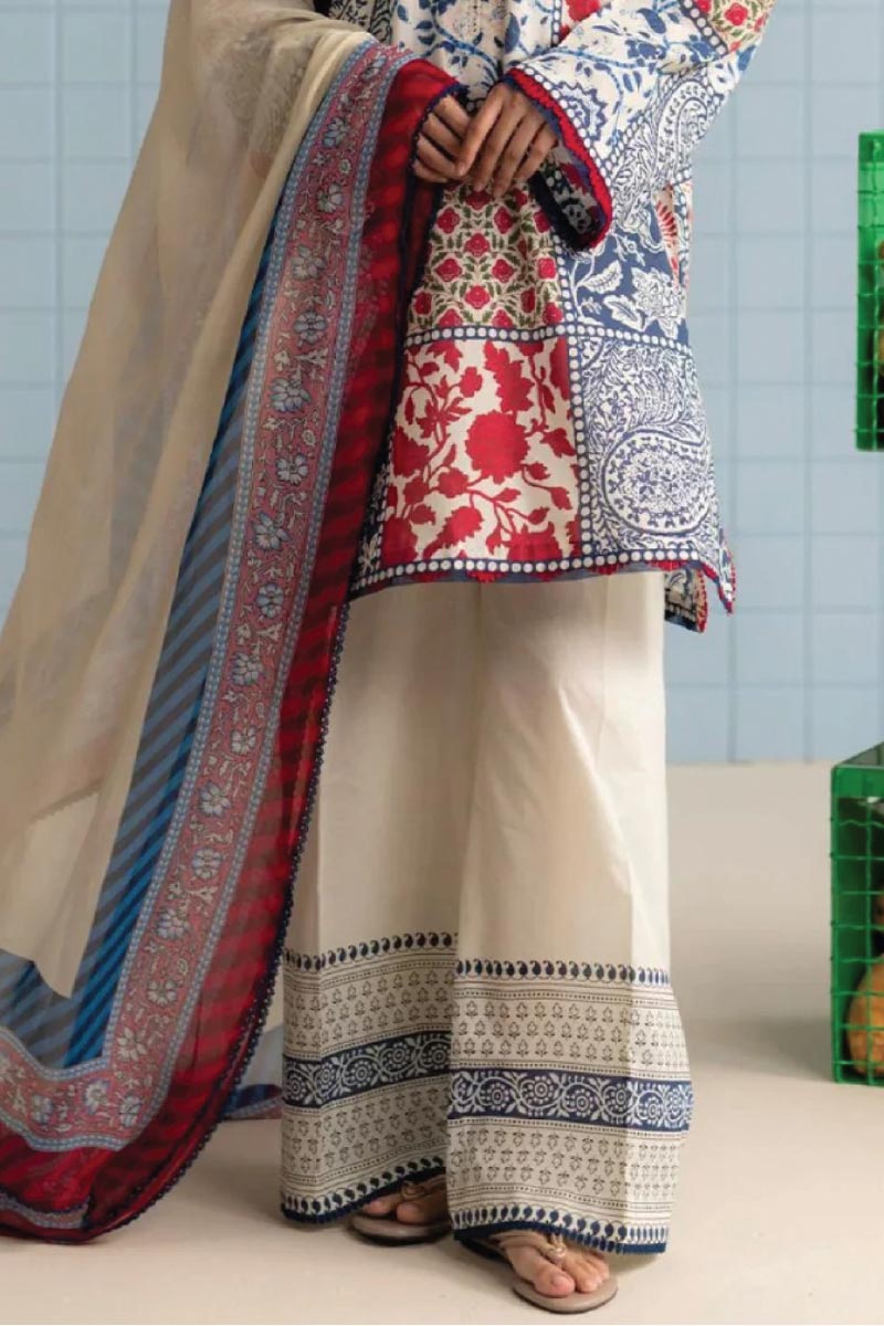 A block-printed shirt in earthy tones with off-white trousers, finished with a light chiffon dupatta-grounded, airy, and made for everyday ease.