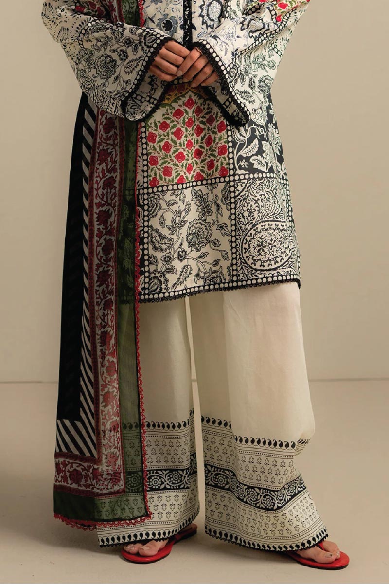 A charcoal-toned shirt with off-white pants and a breezy chiffon dupatta—minimal, moody, and effortlessly refined.