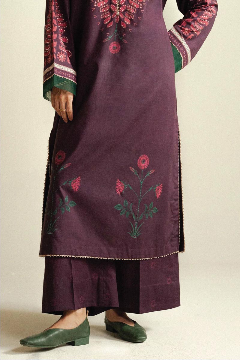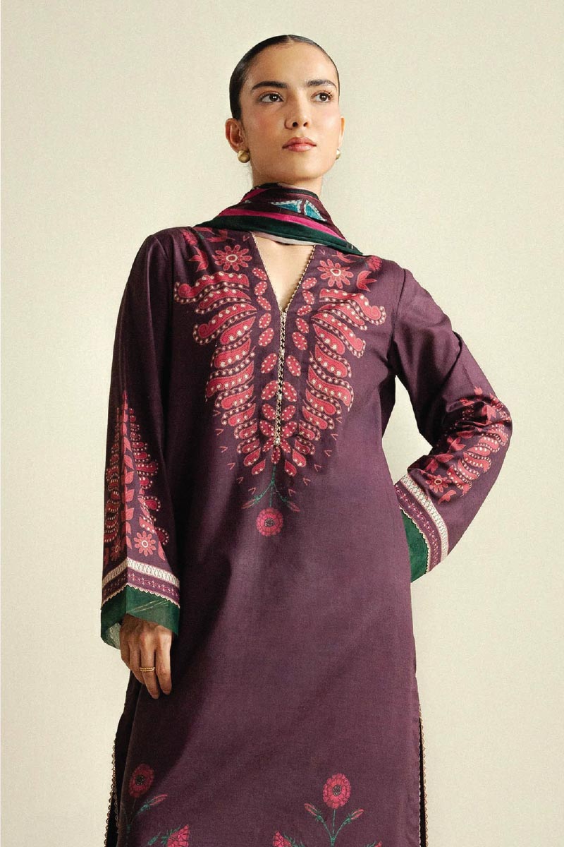 A rich plum maroon shirt paired with a printed trouser and a matching dupatta, creating a timeless contrast of depth and softness.