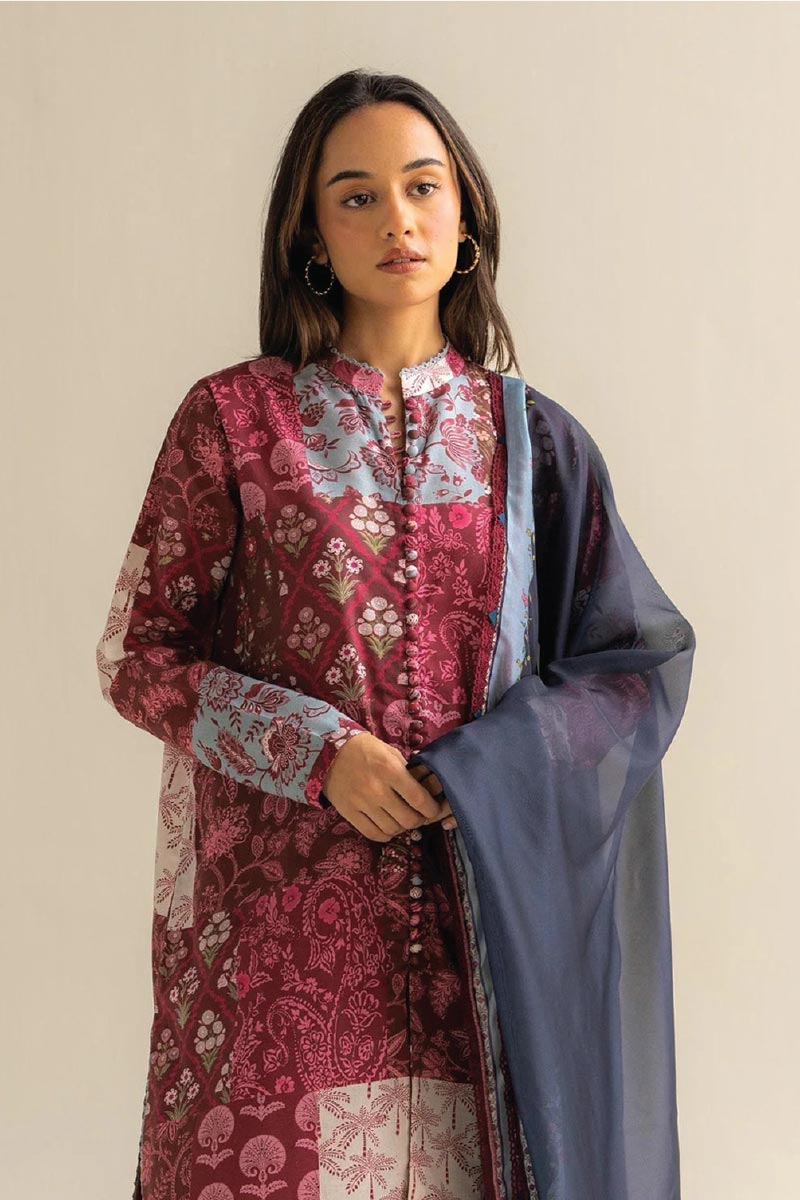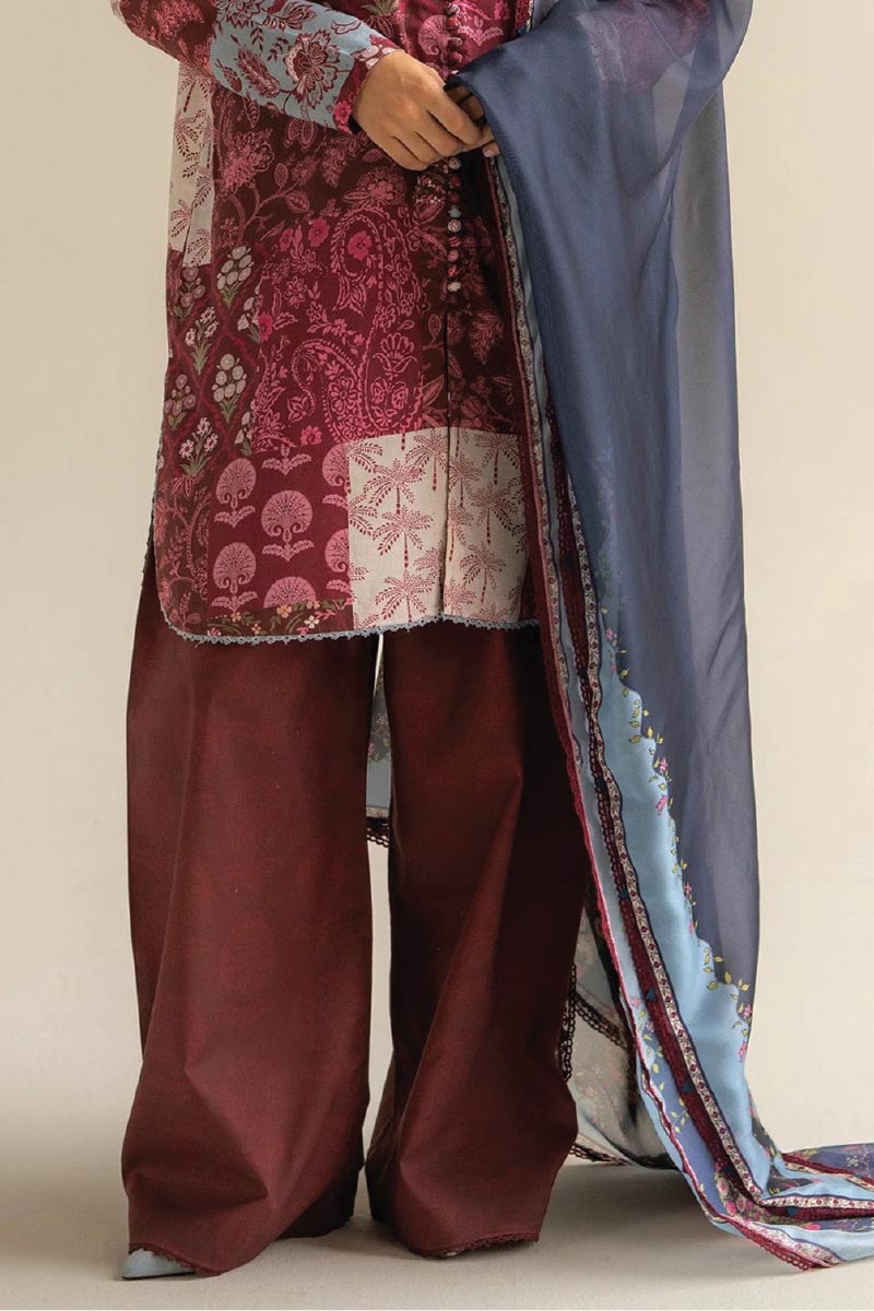 Patchwork-inspired burgundy shirt and pants, paired with a rich silk dupatta-artful, warm, and full of texture.