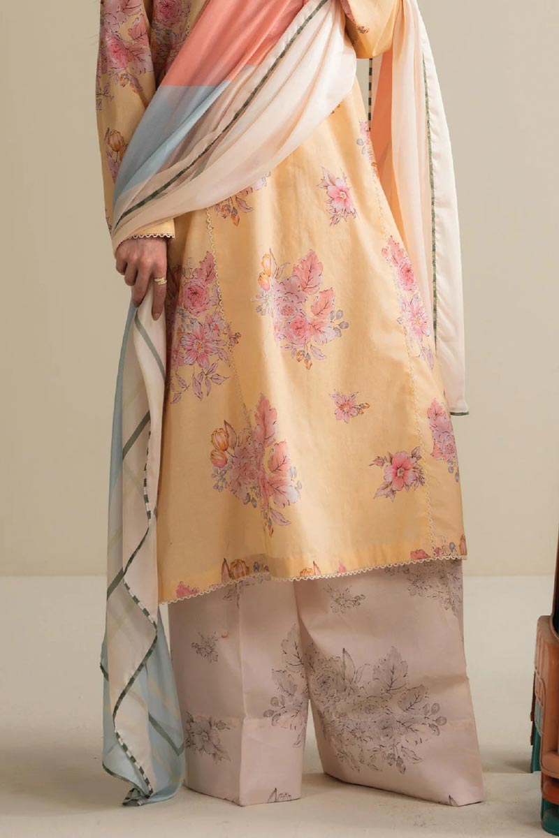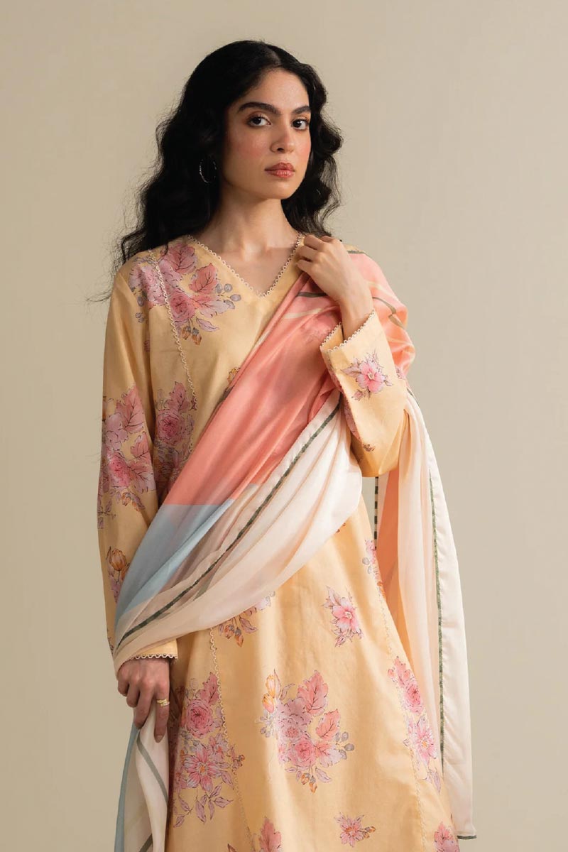 A soft floral yellow and pink shirt with ivory trouser, paired with a fluid silk dupatta - fresh, feminine, and easy to wear.