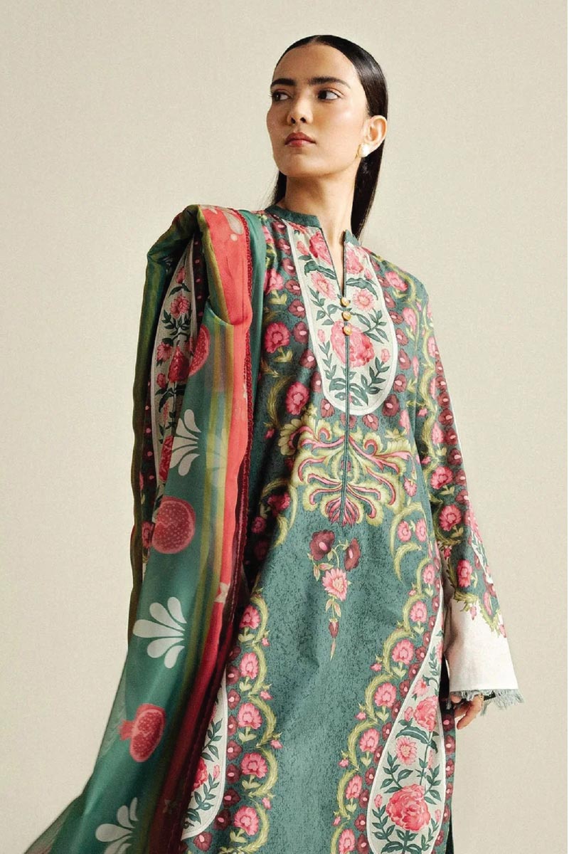 A muted teal shirt enlivened with a lively play of multicolors, paired with a textured trouser and a mint green dupatta that lifts the palette with freshness.