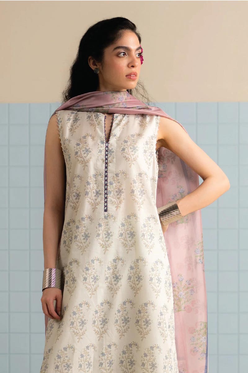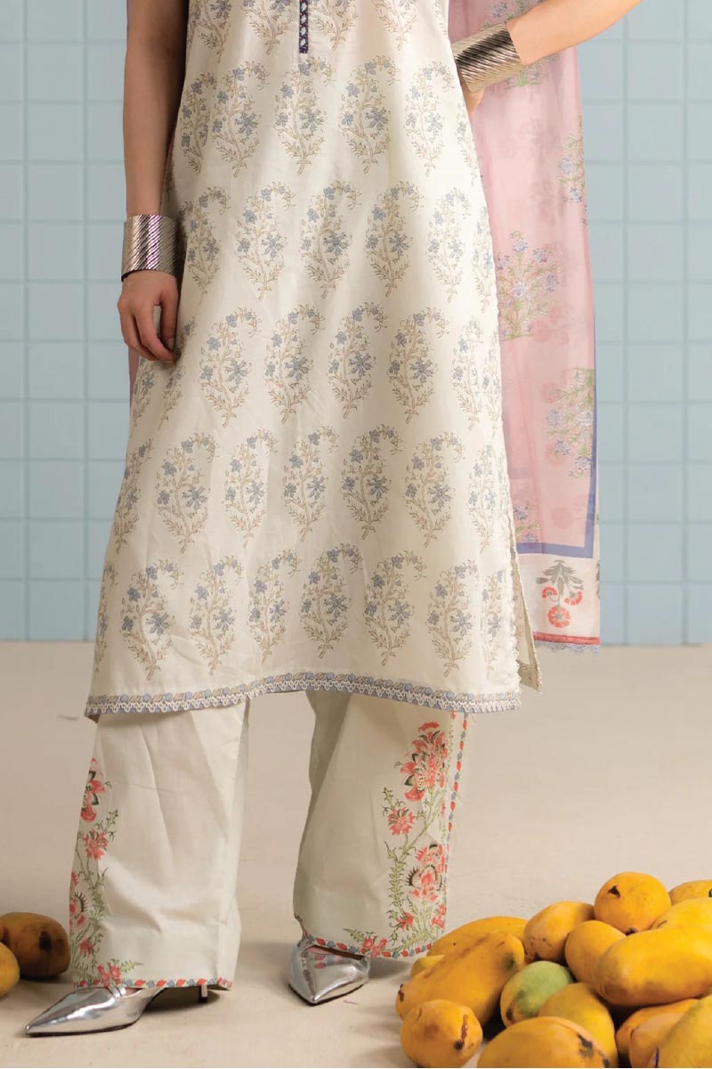 A paisley print on silver satin grey, paired with composed trouser and a silk dupatta—subtle sheen, timeless ease.