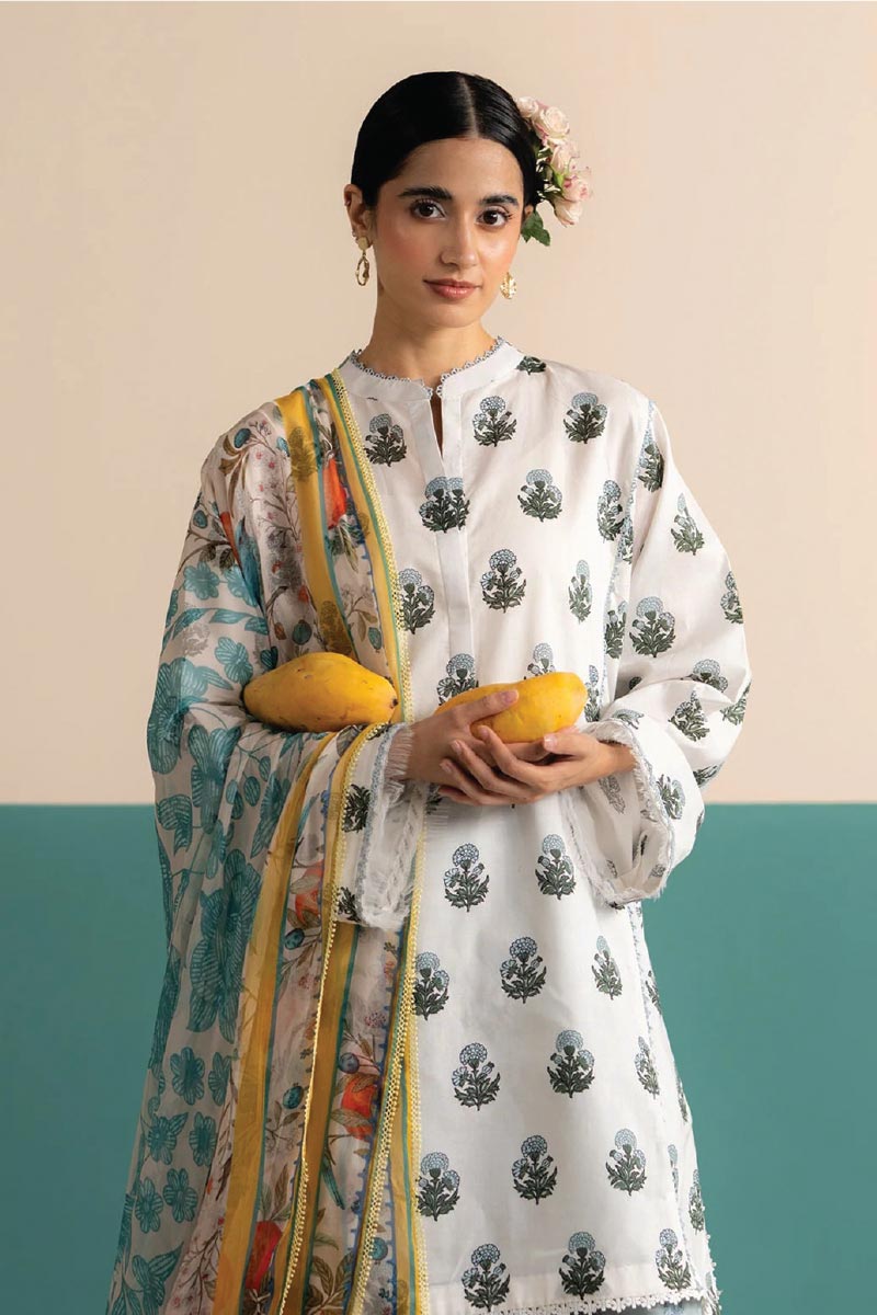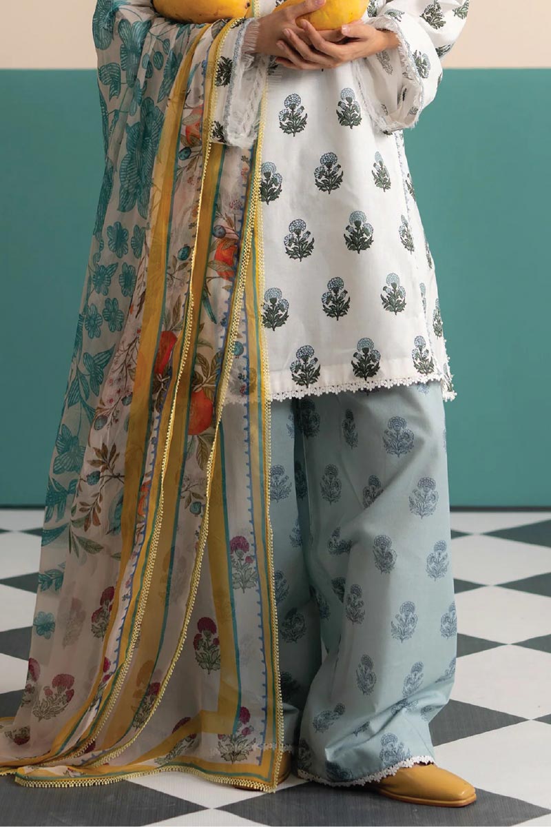An off-white block printed inspired shirt with colonial aqua trouser, paired with a light chiffon dupatta—cool tones with an effortless vibe.